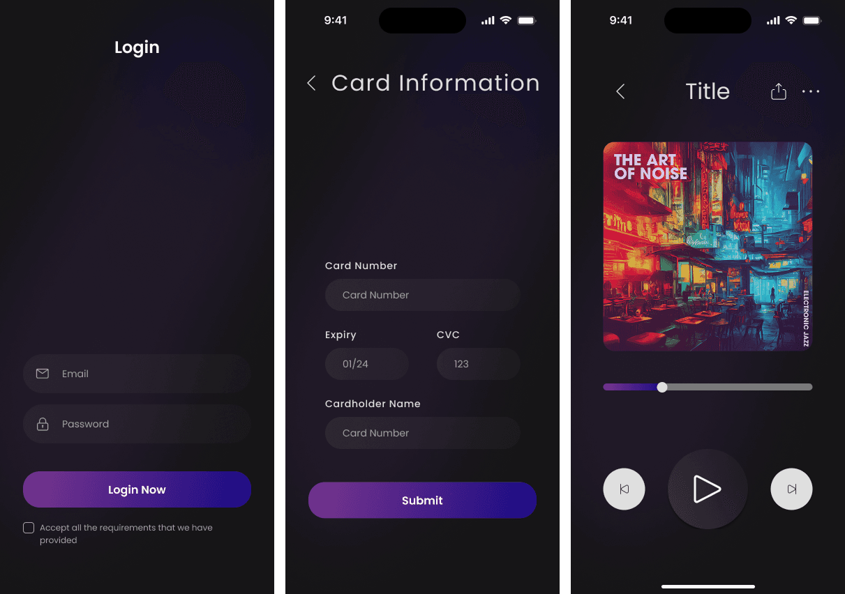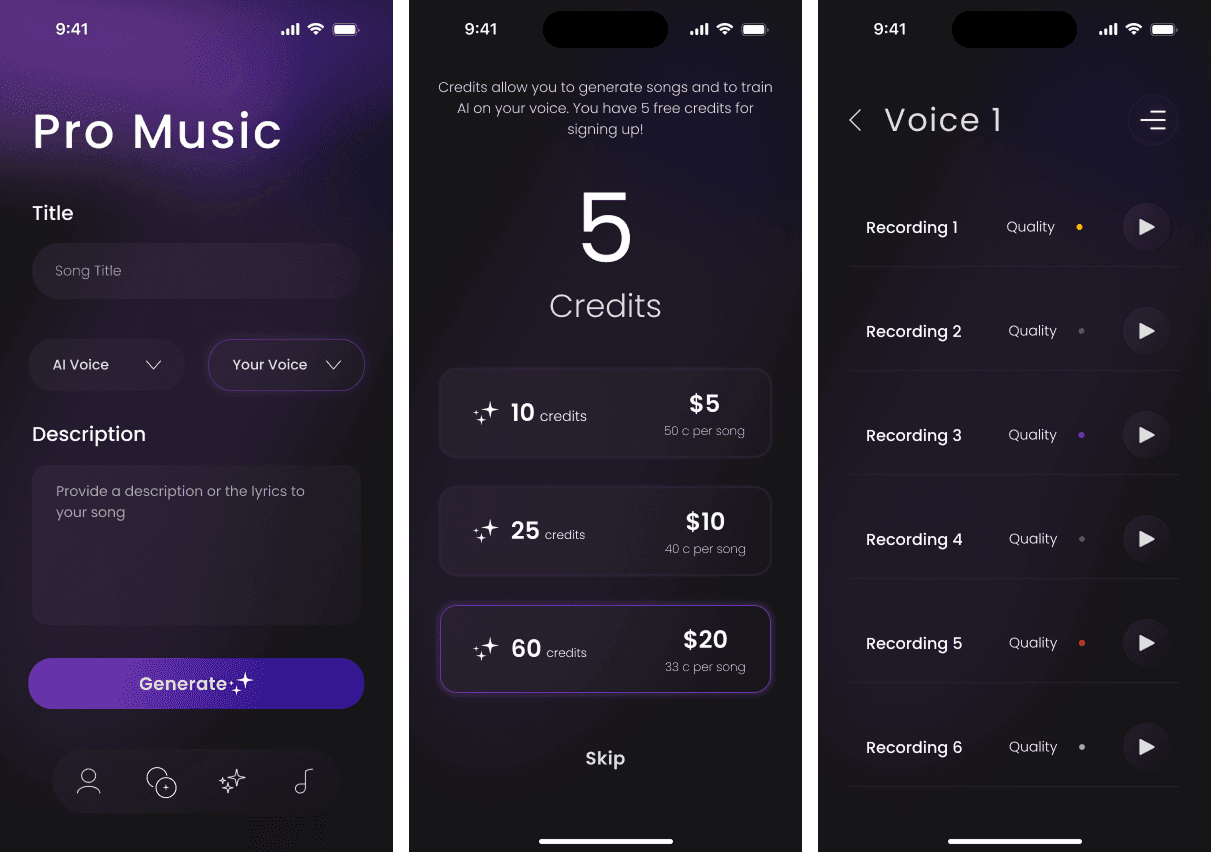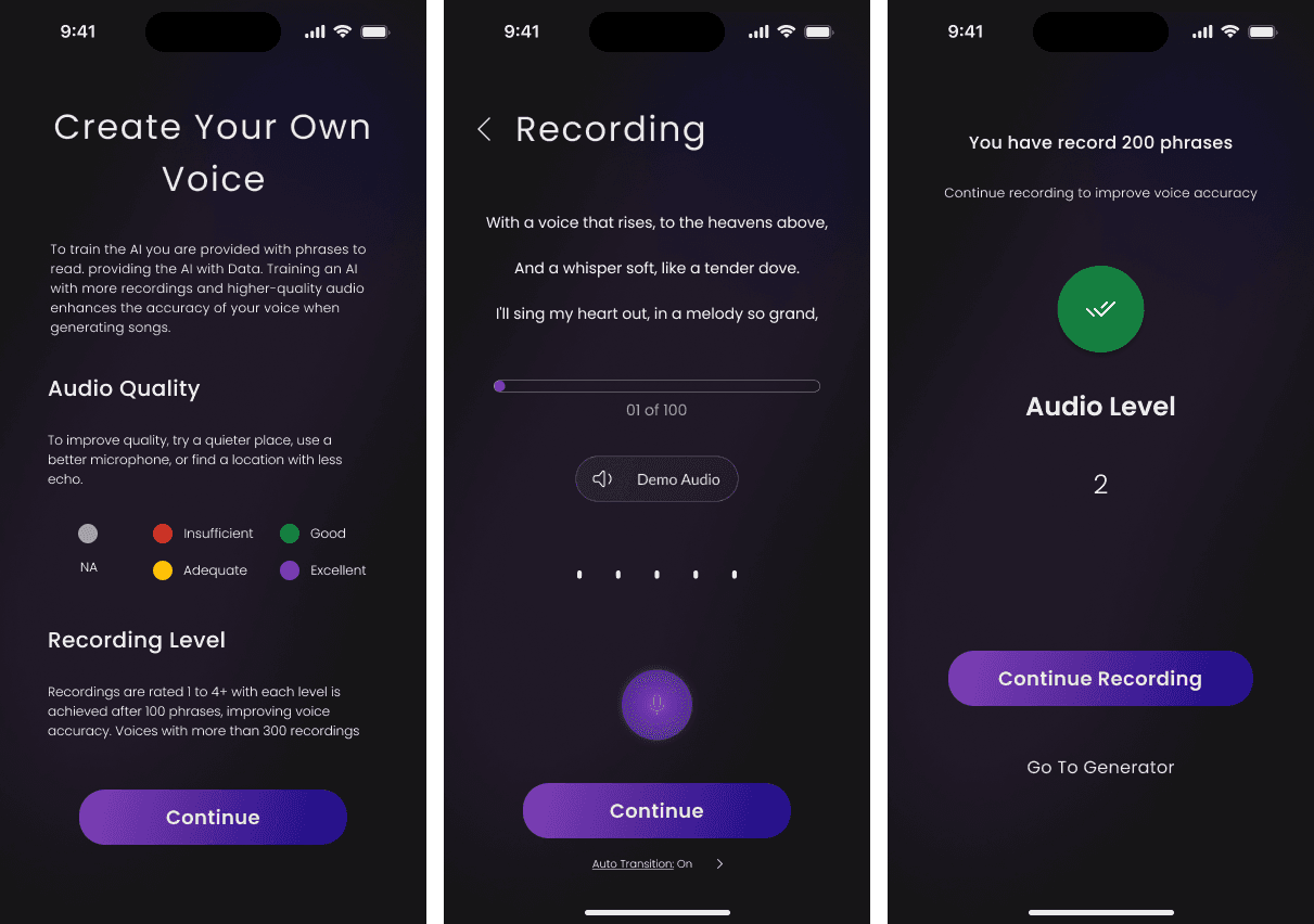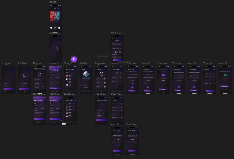 This was a client project where I was tasked with creating a high-fidelity mockup for an AI music app. The app needed a user flow allowing incremental voice training with an AI model, enabling users to progressively train their voice rather than all at once, and then use the trained voice to generate songs. Additional requirements included a monetization system, a music library, and a trained voice library.