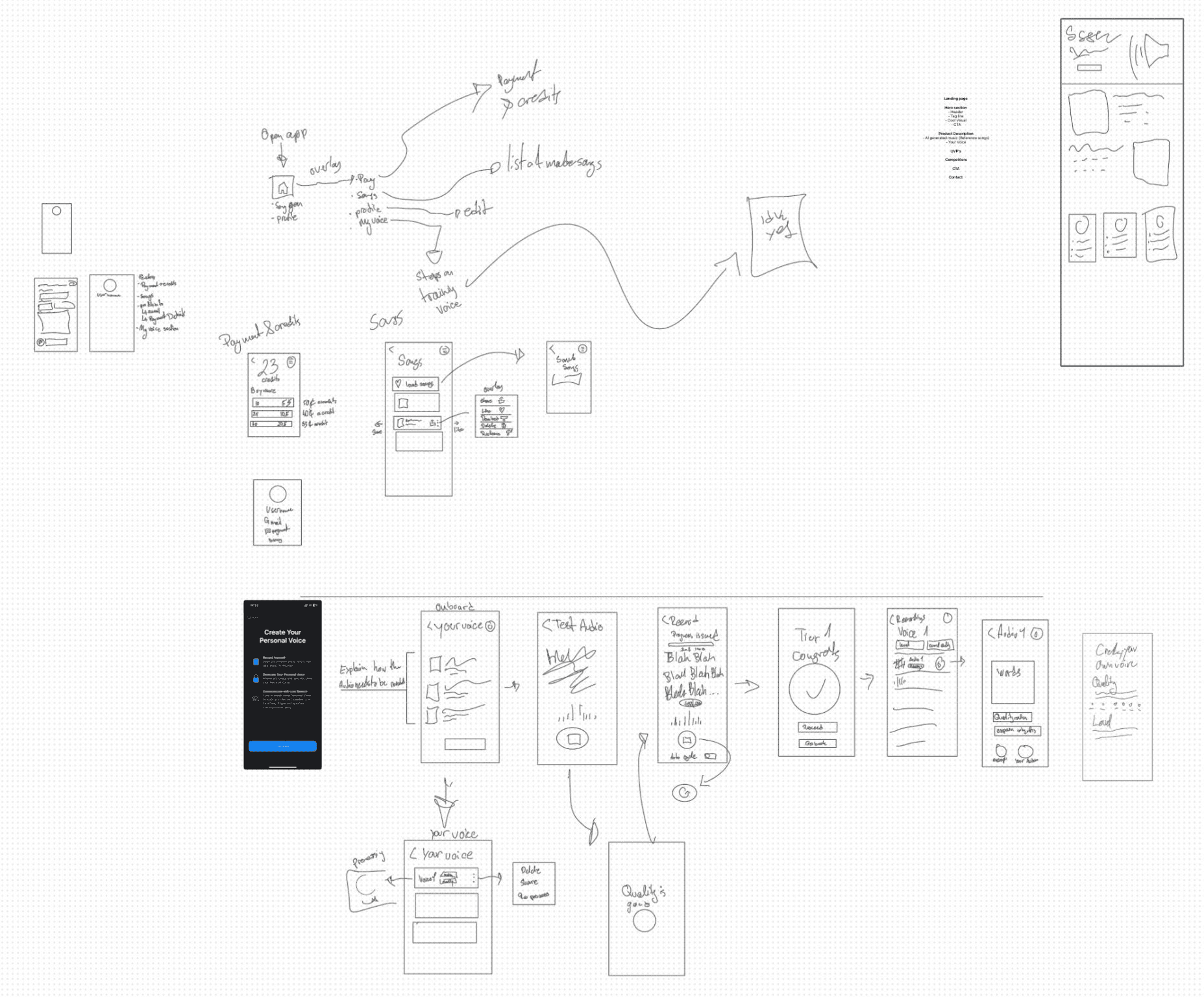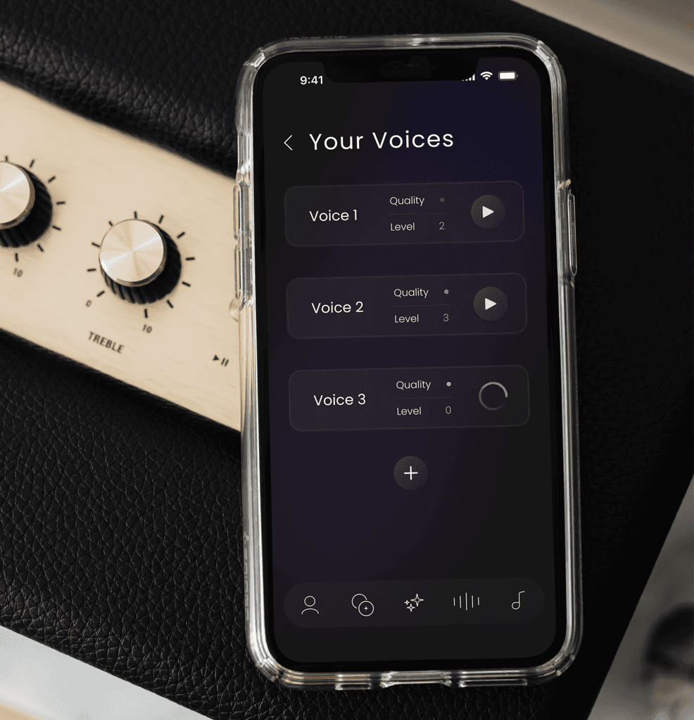 The process began with research into how current AI models, specifically Apple's personal voice feature, learn people's voices. It was important to understand this technology thoroughly to create an appropriate user flow. In depth benchmarking informed the approach to project. Companies such as Songlorious and Songfinch were used to evaluate how existing services function, and how to differentiate on the market. This stage of development proved crucial from a product development perspective.