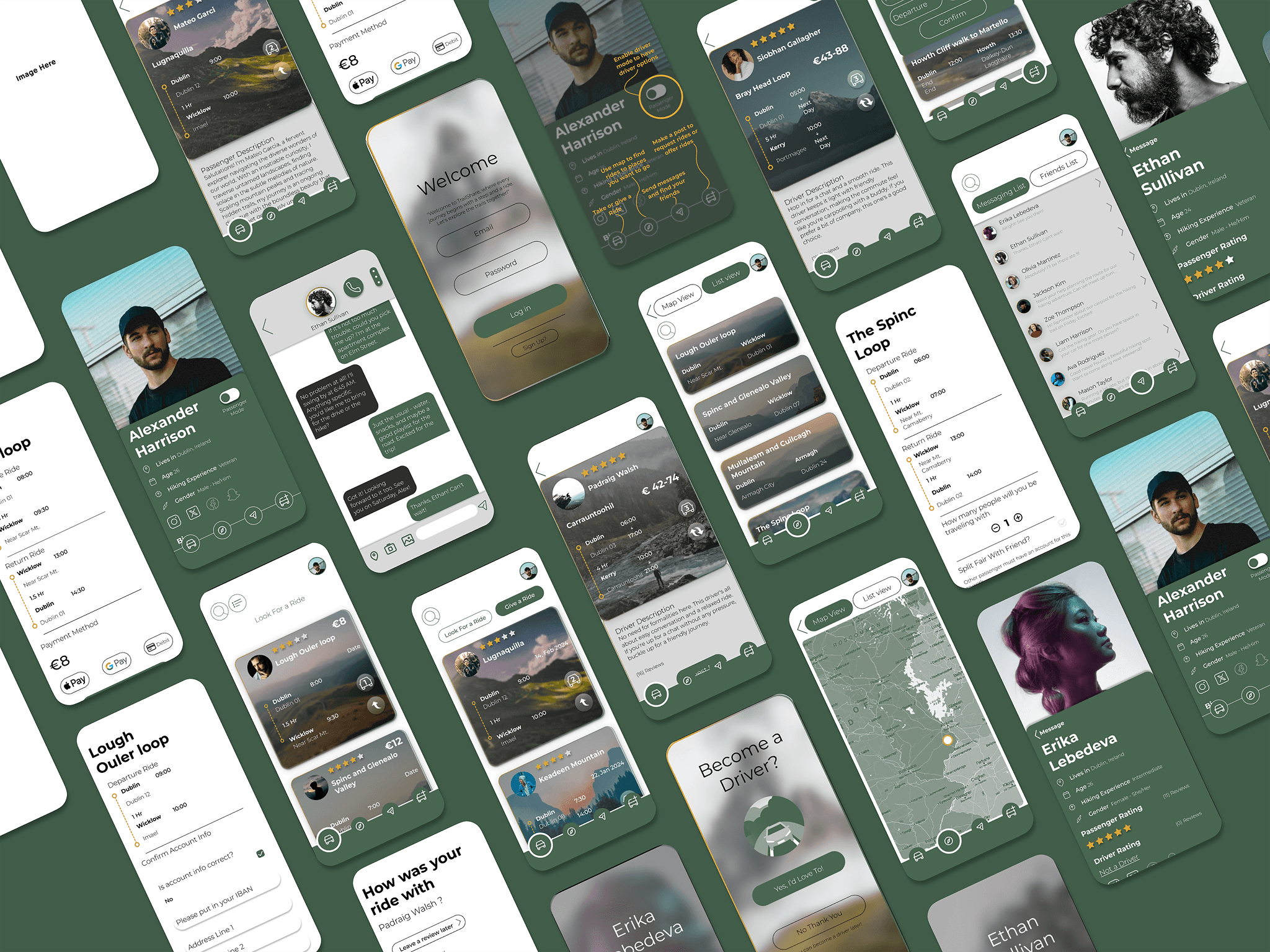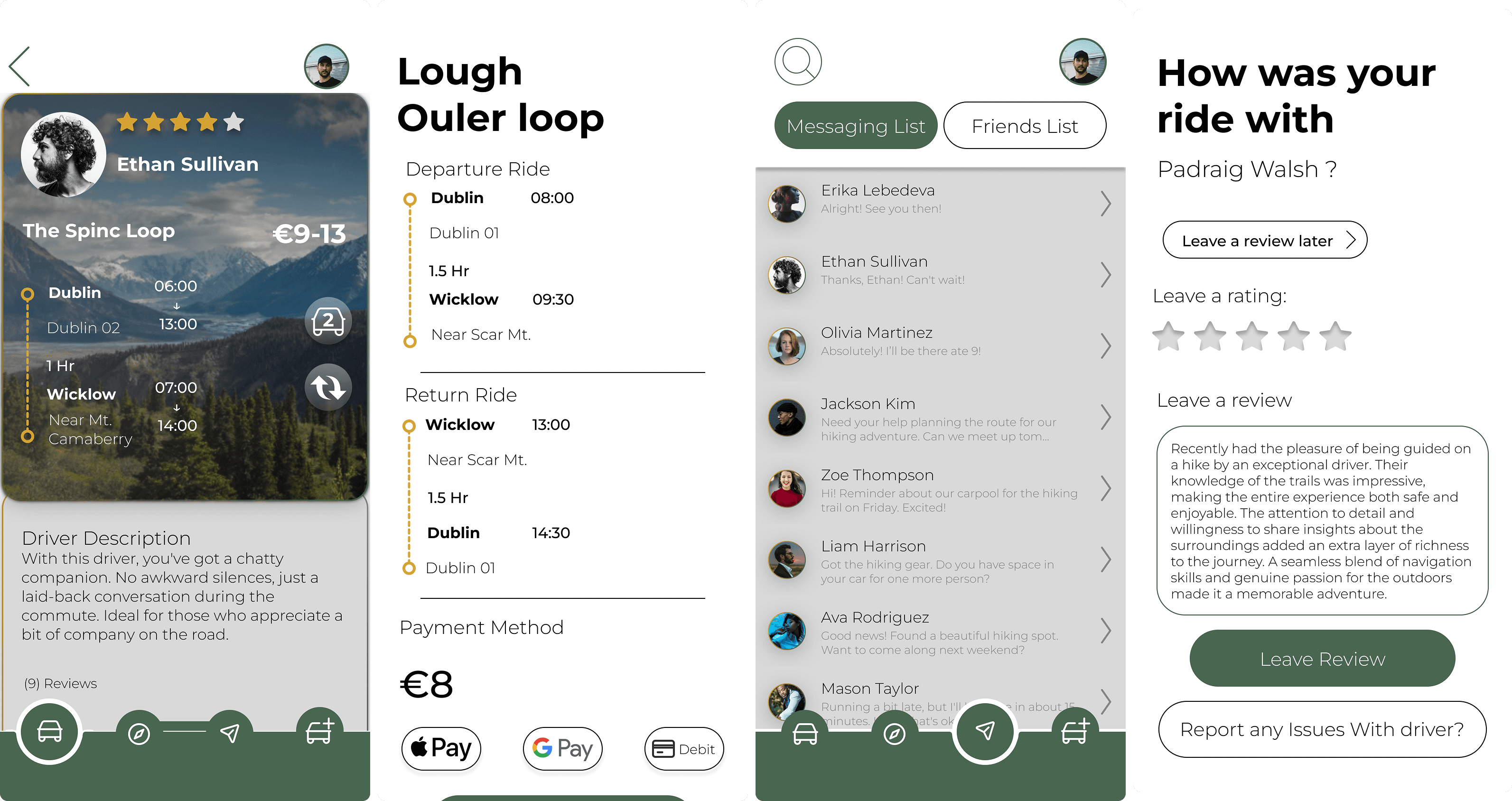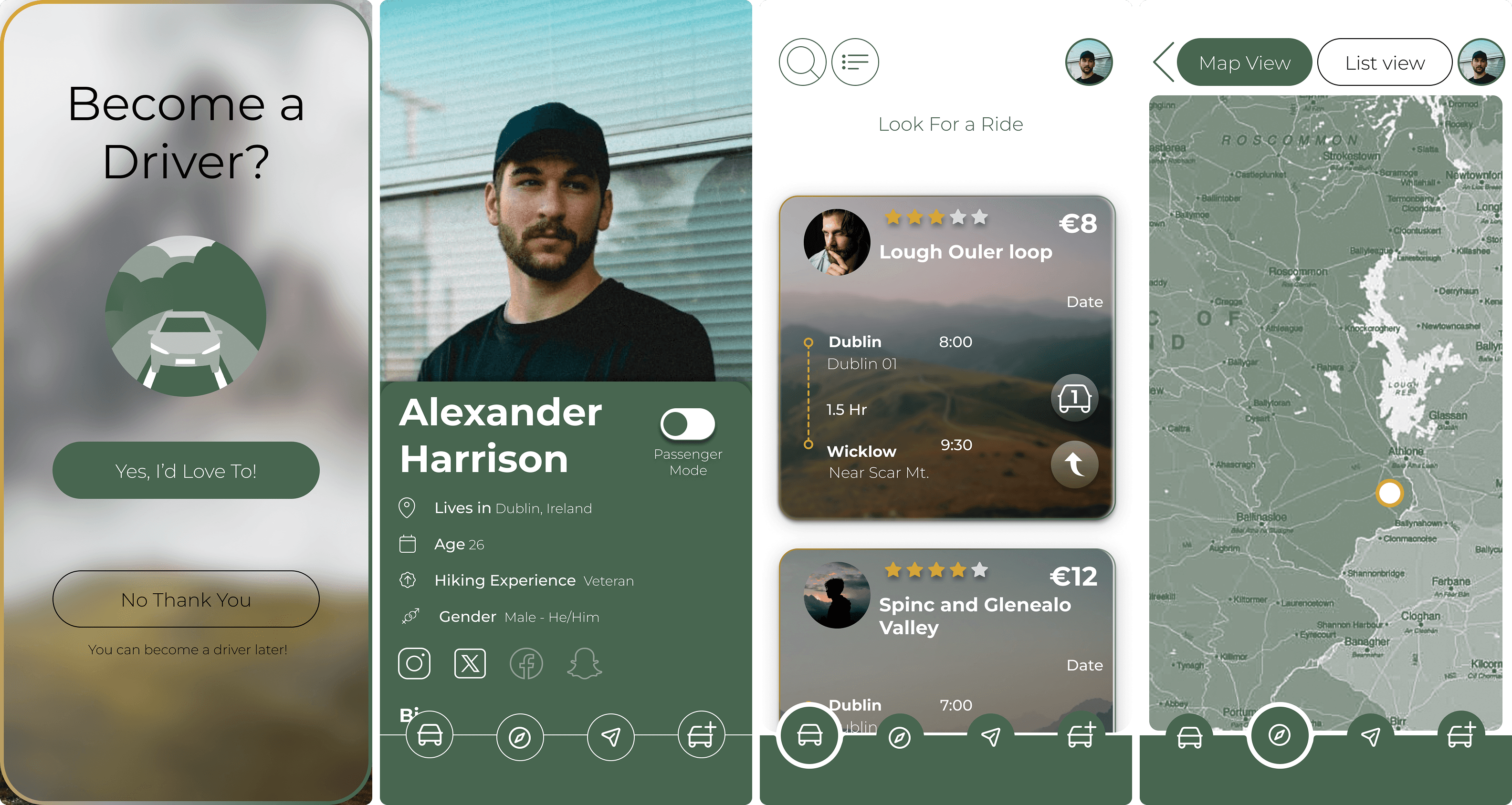 “Design an app on the mobile marketplace that provides a service connecting hikers that drive with those that do not, making hiking more accessible to those that do not have cars. The design must focus on straightforward UI that has an emphasis on trust and connectivity to develop a community on the platform”