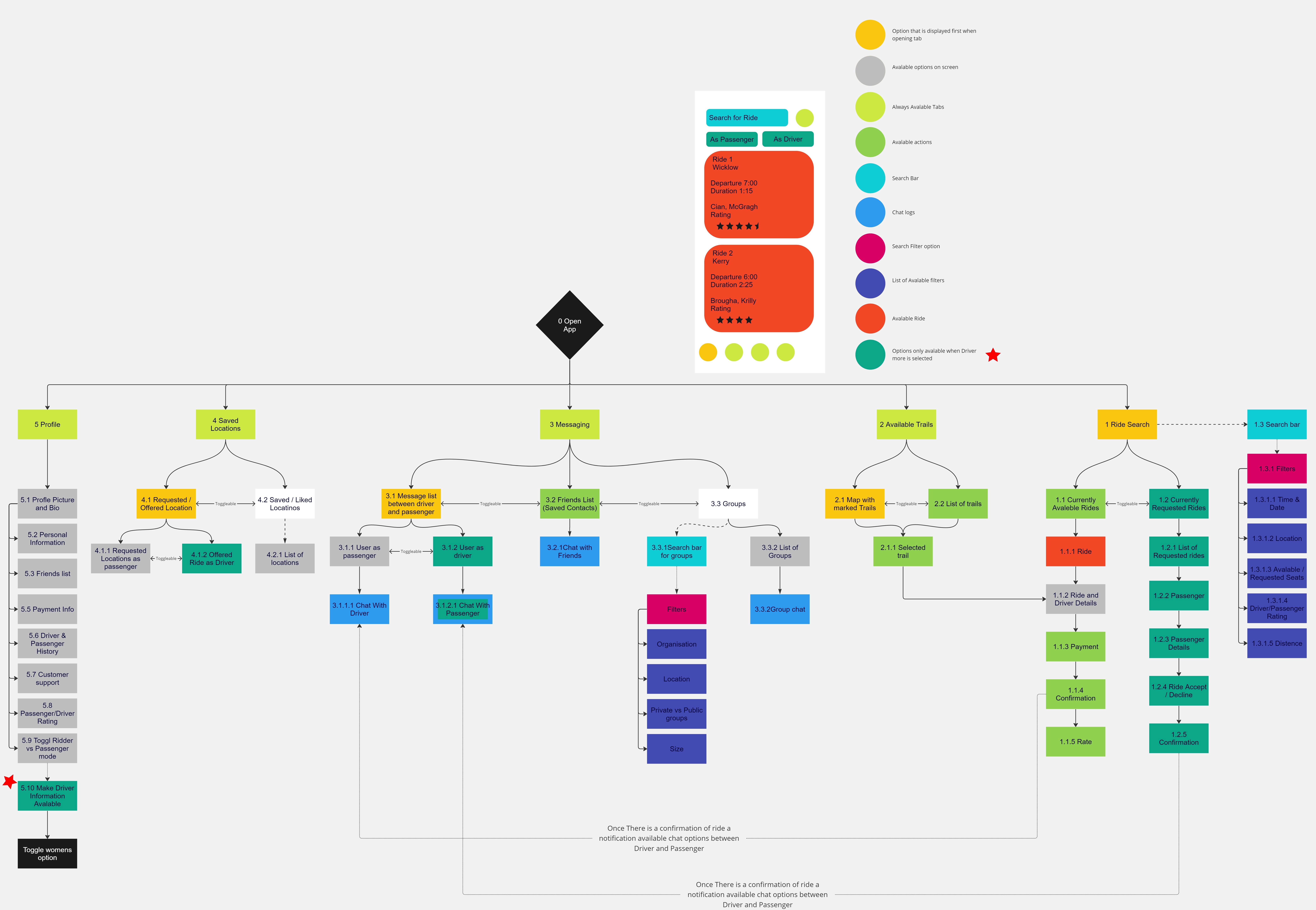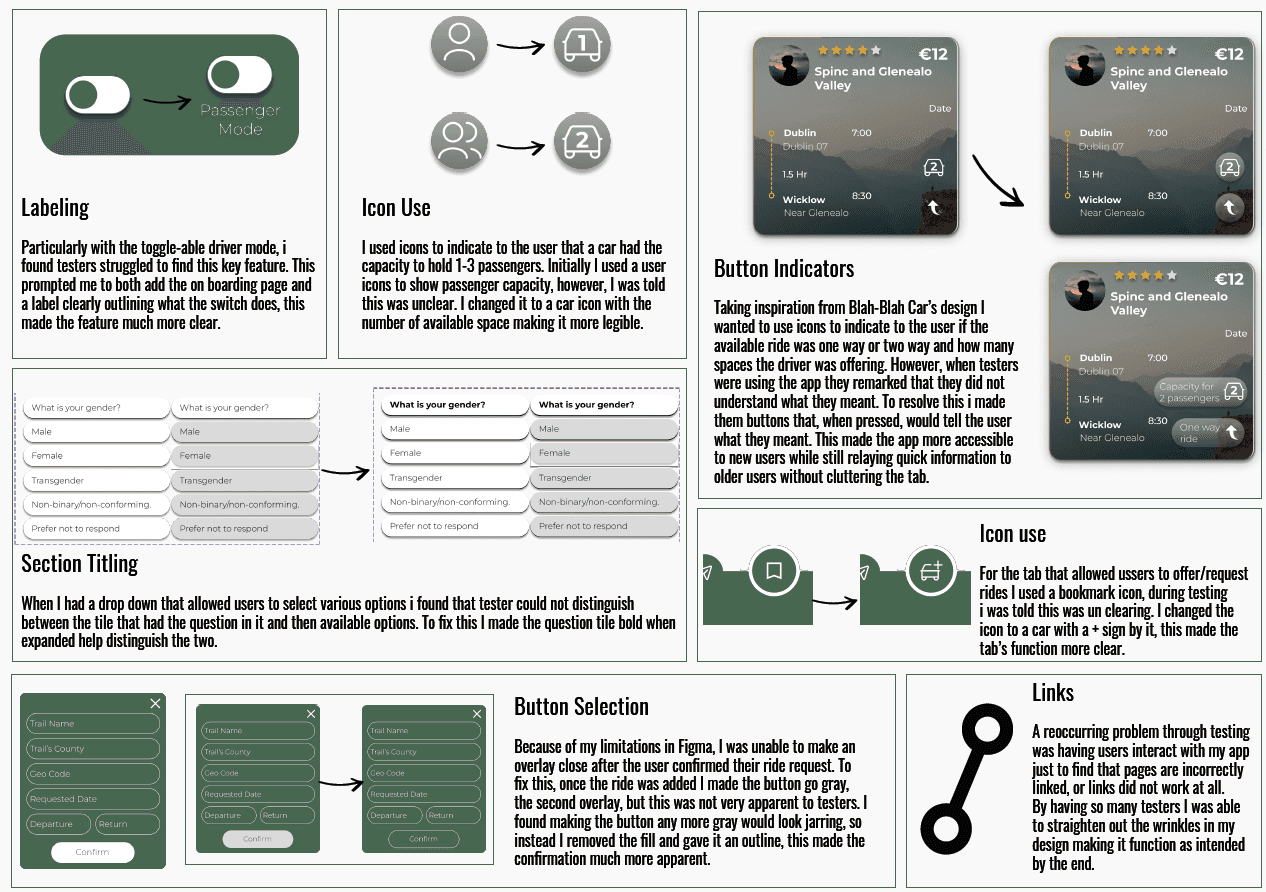 Action Flows involved participants performing specific tasks to identify usability issues. Tasks ranged from sign-up processes, messaging, booking rides, and driver/passenger interactions, highlighting key areas for improvement. The following is a list of some of the findings and subsequent improvements derived from the user tests.